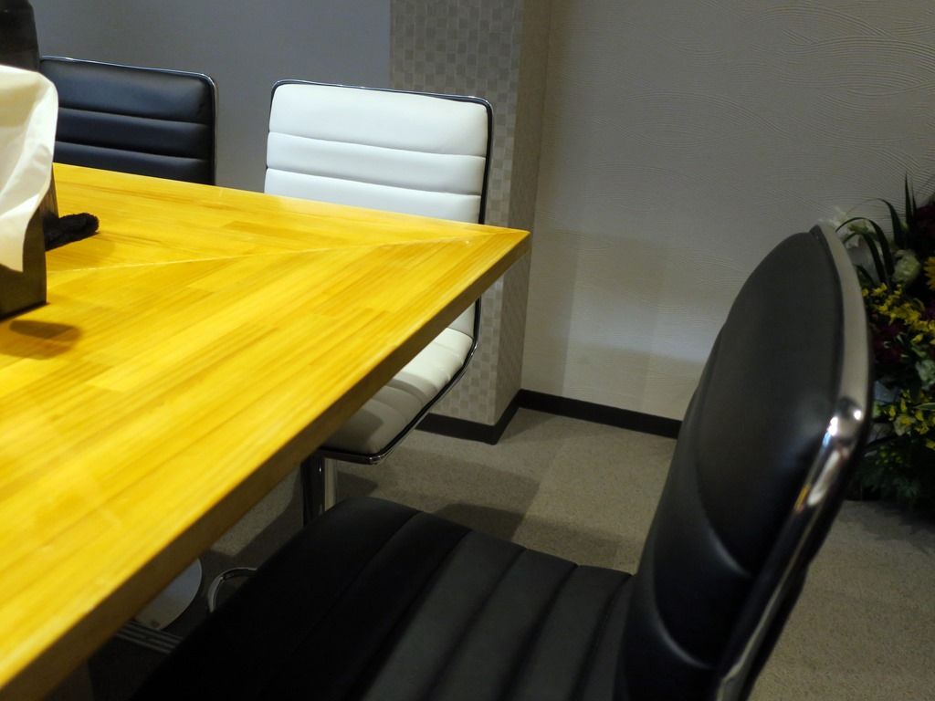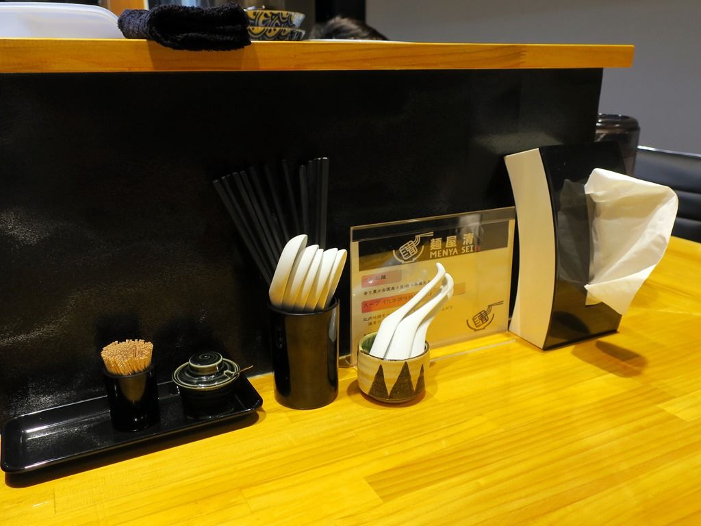 BGMはポップス・ラップ。箸は洗い箸でエコ仕様。卓上調味料は、七味唐辛子。