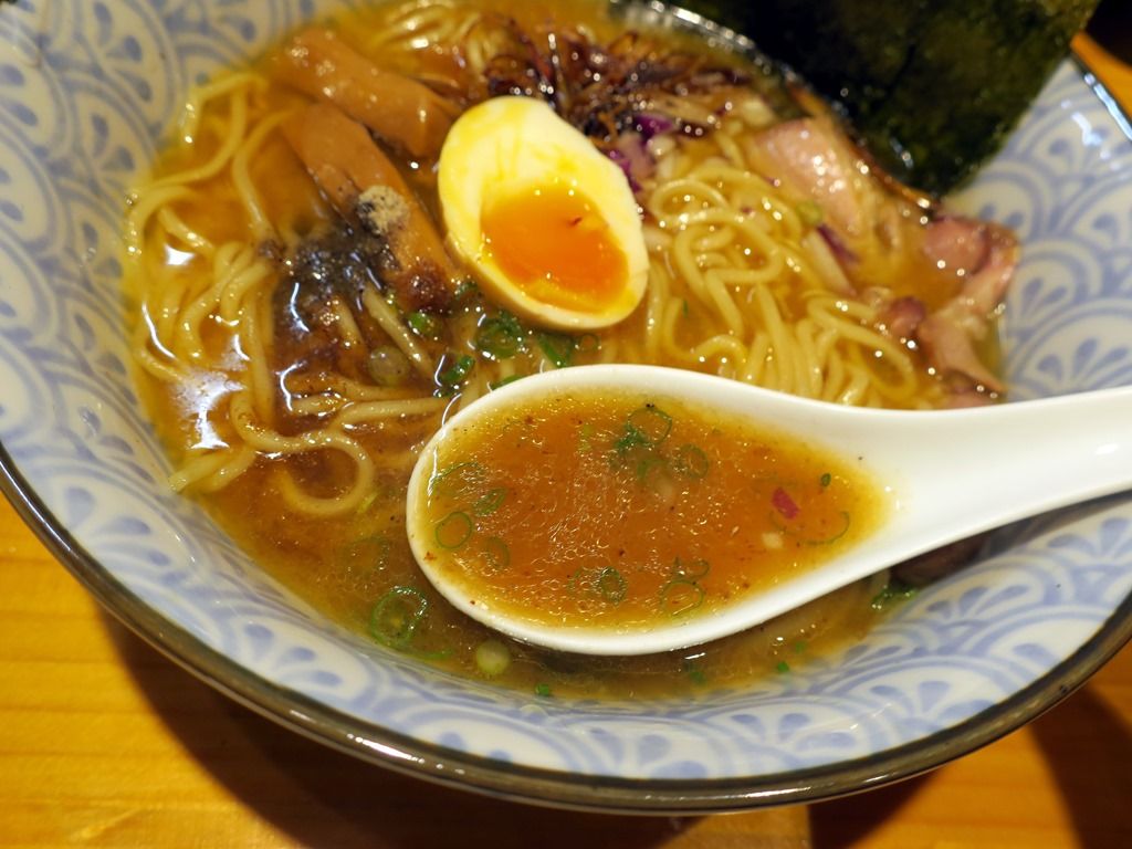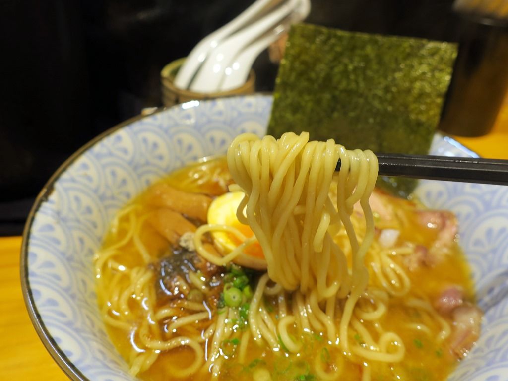 スープは、とろみのある濃厚な鶏白湯魚介醤油味。比内地鶏使用とのことで、銘柄地鶏を使いながら清湯ではなく白湯を摂るのは贅沢なレシピ。タレは5種類の醤油をブレンドで、そのせいか不明ですが結構味濃いめ。個人的には許容範囲内で、無化調を感じさせないガッツリとした旨味があって、とても美味しい!