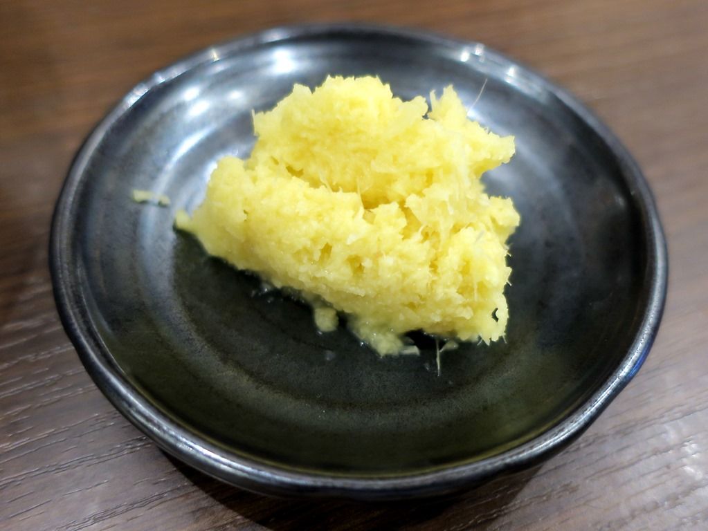 途中辛子味噌や生姜で味変。辛子味噌は豆板醤っぽいペーストですが、全然辛くありませんw 別注無料の生姜はどっさり。さすがにこれだけ入れると、辛くなります^^;