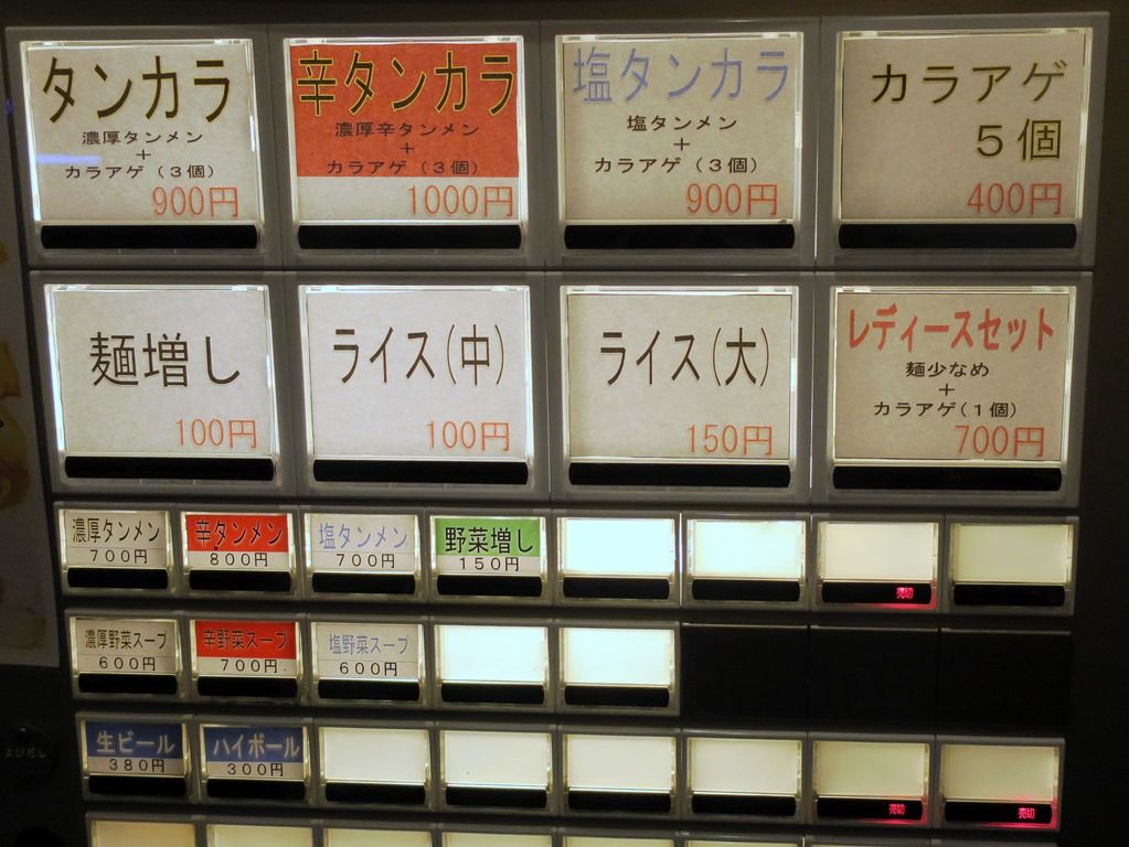 入店すると、まず券売機で食券購入です。主なメニューは、濃厚タンメン700円、辛タンメン800円、塩タンメン700円、タンカラ(唐揚げセット)ブラス200円、他。