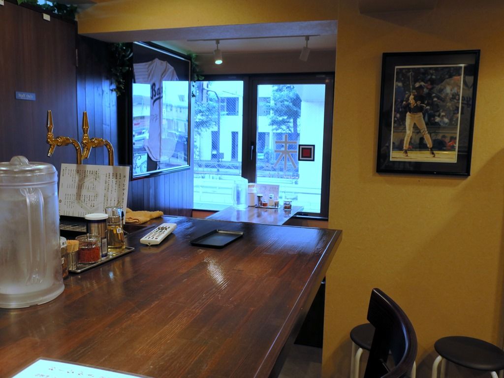 店内はカウンター席からだと後ろになり、入退店時にチラ見しかできませんでしたが、大リーグのチームのユニフォームやイチロー選手の写真などがディスプレイされています。席はカウンター4席、4人卓x2。厨房は隣の小部屋で、客席からはまったく見えません。後客4。