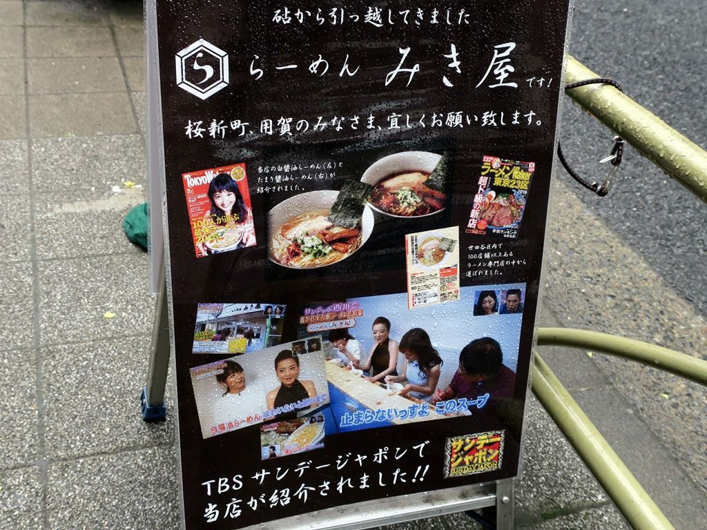 舗道のA型立て看板には、メディア登場の紹介掲示。