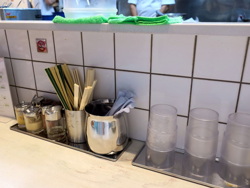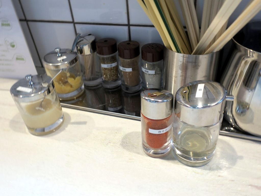 BGMはテレビ放送。箸は竹製洗い箸でエコ仕様。卓上調味料は、ニンニク、生姜、胡麻、魚粉、胡椒、唐辛子、酢。
