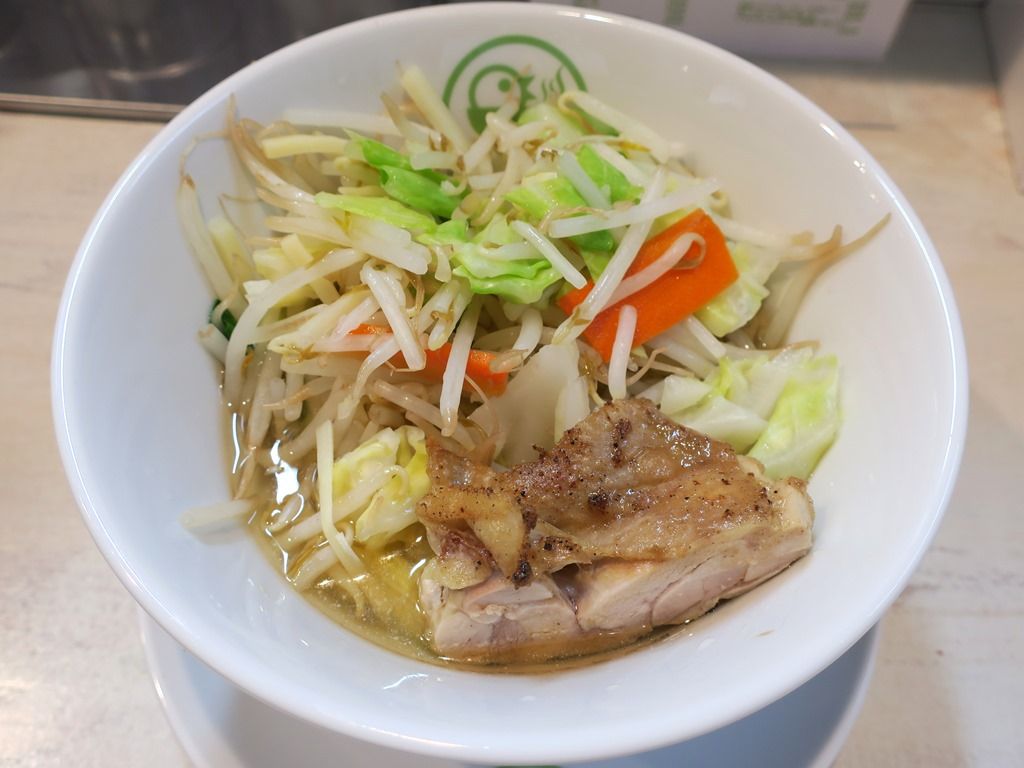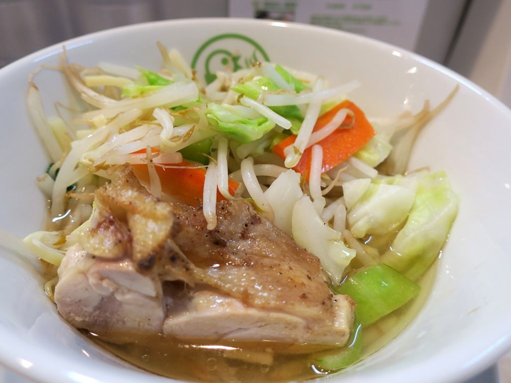 トッピングの野菜は彩り豊かで量も多め、シャキシャキが心地いいです。ローストチキンはミニサイズで、大きさだけ比べると鶏八郎@十条に軍配かも^^;