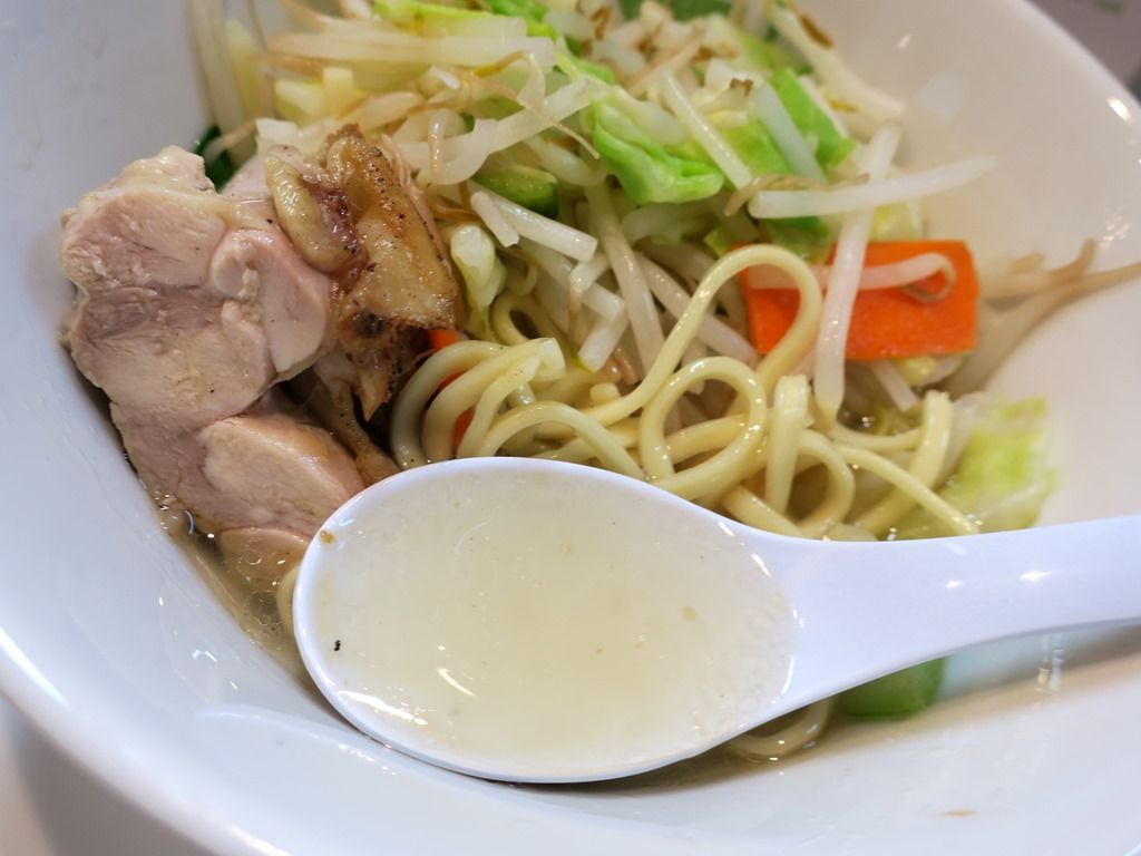 スープは、さらさらの清湯塩味。ですが、油がガッツリ効いたパワフルでインパクトのある味わい。デフォで味濃いめで麺のスープだけだとちょっとしょっぱめ。ですが、たっぷり入った野菜と一緒にいただくと、ちょうどいい塩梅。ニンニクが良く合いそうなスタミナエナジースープですが、塩味ゆえ軽くて案外さっぱり。問答無用でハマる系の味ですごく美味しい!