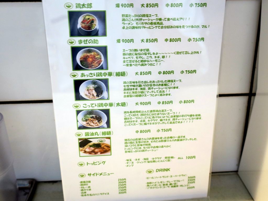 主なメニューは、鶏太郎(小)750円、まぜの助(小)750円、あっさり鶏中華(小・細麺・塩味)750円、こってり鶏中華(小・太麺・鶏白湯塩味)800円、醤油丸(小・細麺)750円、鶏カツ丼250円、チキンカレー250円、他。