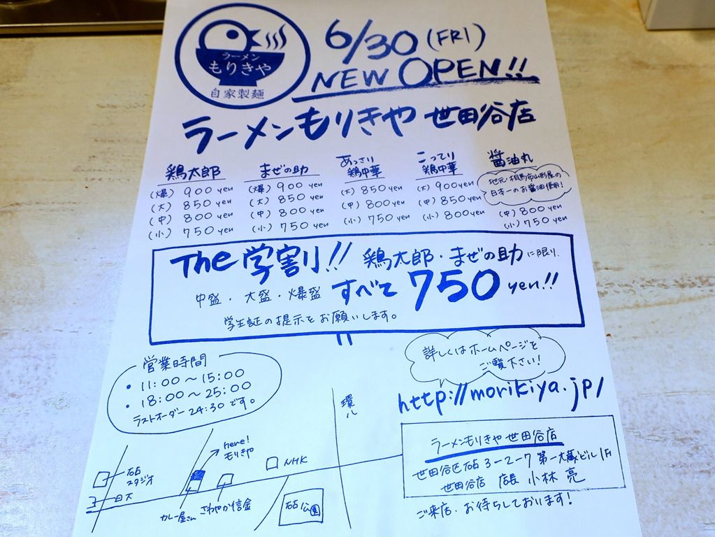 2017年6月30日大安、本日オープンの新店「ラーメン もりきや 世田谷店」へ。