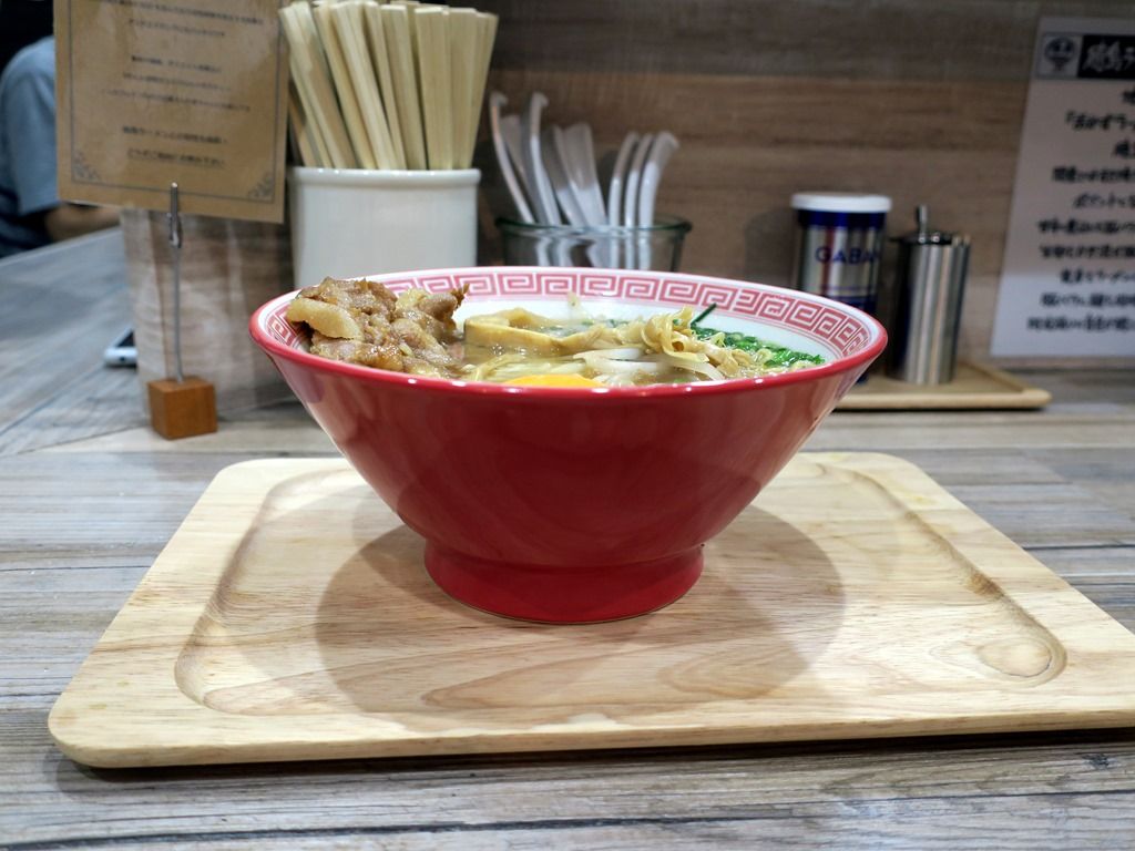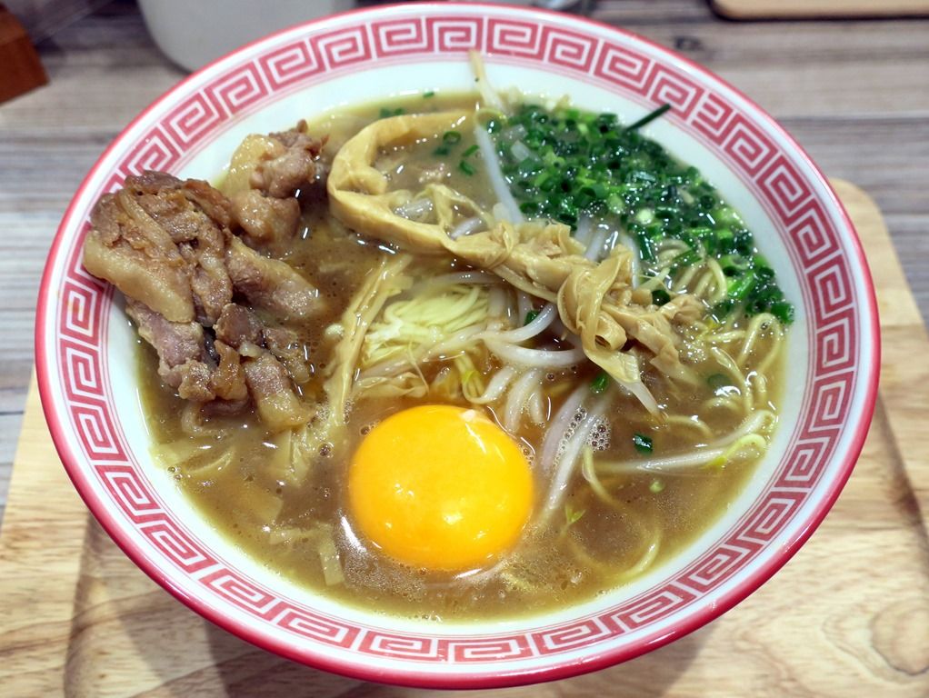 動揺を隠しながらも、写真撮りますとデジカメを構えて宣言したところ、あ、「あ、ちょっと待って下さい」と一旦下げられて、崩れた卵黄をレンゲで除去、新しく卵黄をトッピング、なにやら追加で穂先メンマをトッピング。「どうもすみませんでした」と再登場!