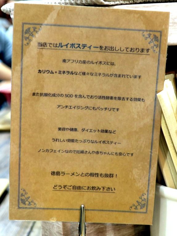 カウンターには、度島ラーメンの美味しい食べ方掲示。お茶はルイボスティーのインフォメーションカードも用意。