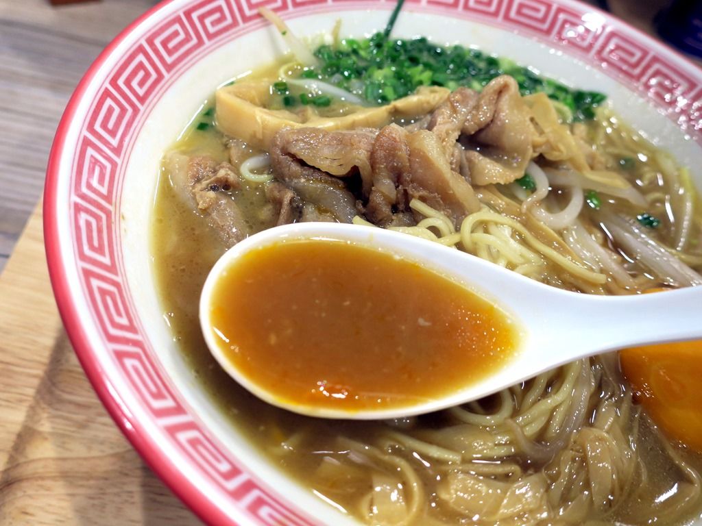 スープは軽くとろみのある微乳化の豚骨醤油味。系統的に言うと茶系。カエシ立ち気味で徳島ラーメンのセオリー通りご飯が合いそう。ただしょっぱいってほど味濃いわけでなく、そのままでもゴクゴクいけちゃいます。丁寧な仕事と炊き込みが窺われるスープで、とても美味しい!