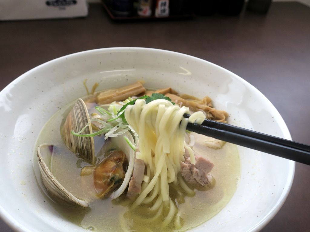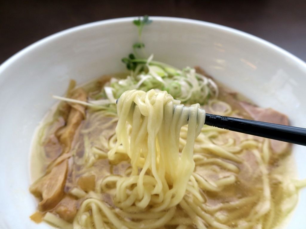 スープはさらさらの清湯塩味。貝の旨味がガッツリ効いた猛烈な貝出汁清湯で、どれだけ凄いかというとまるえ食堂@東小金井を思い出しちゃったほど。カエシも申し分なく、塩の旨味も鮮烈なキレのある味わい。いきなりのハイパークオリティで最高に美味しい!