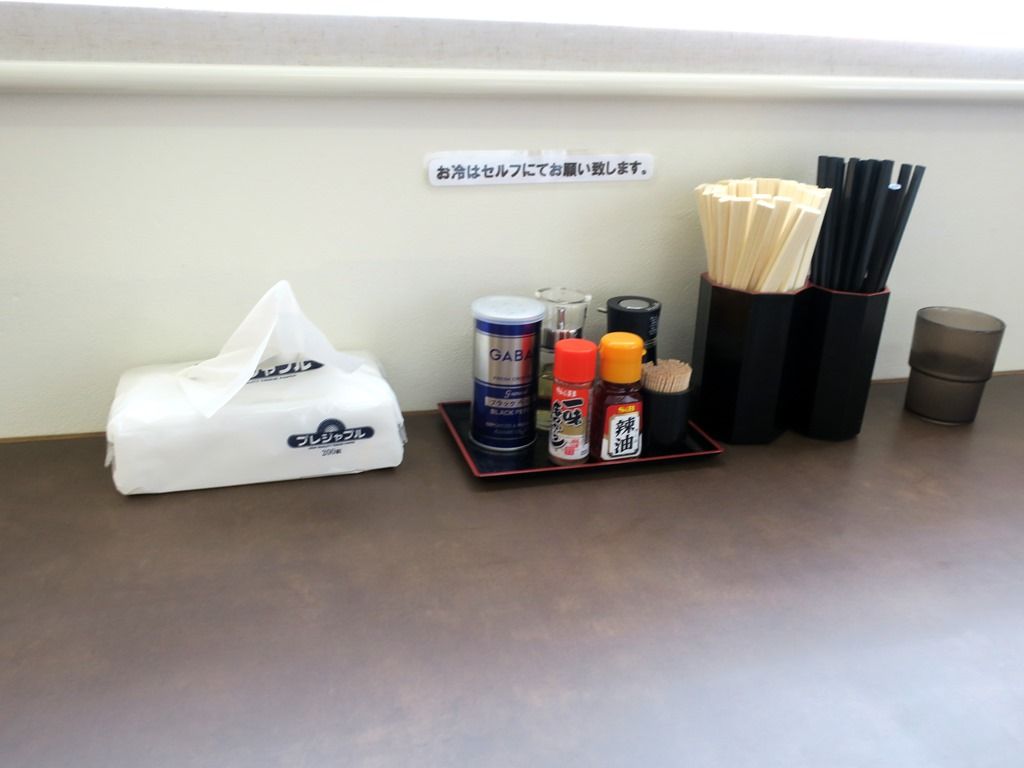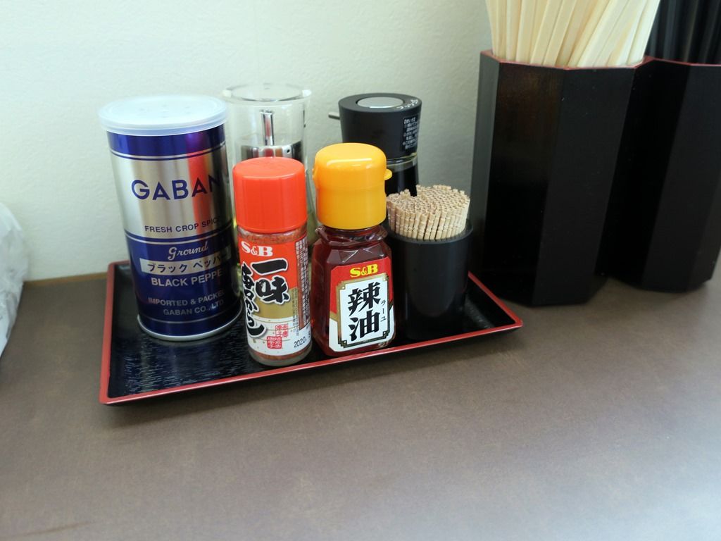 卓上調味料は、GABANブラックペッパー、S&B一味唐辛子・辣油、酢、醤油。