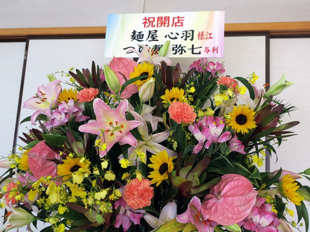 店内券売機横に、つけ麺弥七からの開店祝花。
