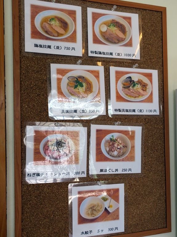 主なメニューは鶏塩拉麺 並盛750円、貝塩拉麺 並盛850円、ねぎ塩チャーシュー丼300円、豚ほぐし丼250円、他。プレオープン中ゆえか貝塩拉麺は1日10食限定とハードル高め。
