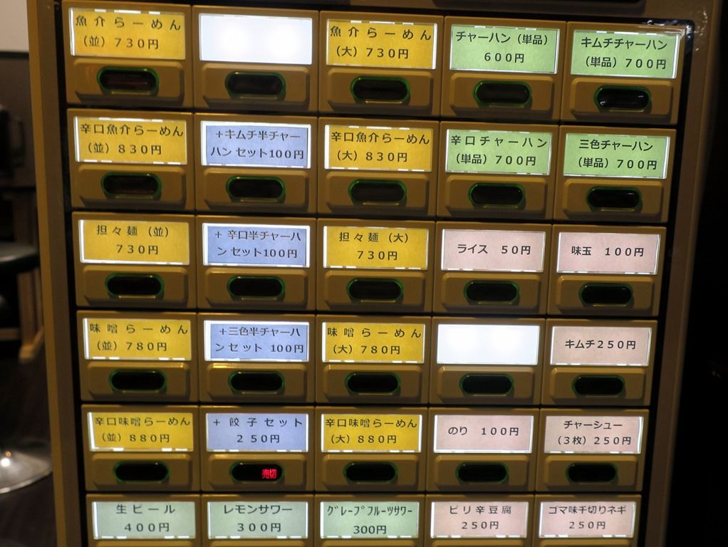 入店前にまず店外店頭券売機で食券購入です。主なメニューは、魚介らーめん730円、辛口魚介らーめん830円、担々麺730円、味噌らーめん780円、辛口味噌らーめん880円、