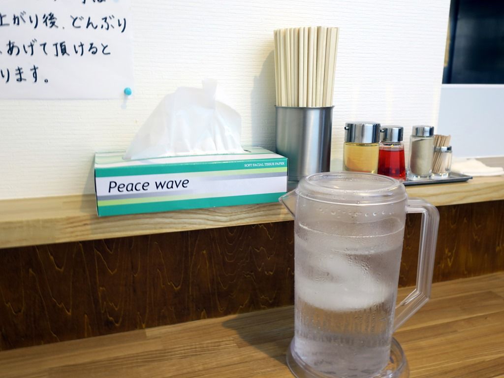 BGMはJ-Pop。箸は割り箸。卓上調味料は、酢、ラー油、白胡椒。