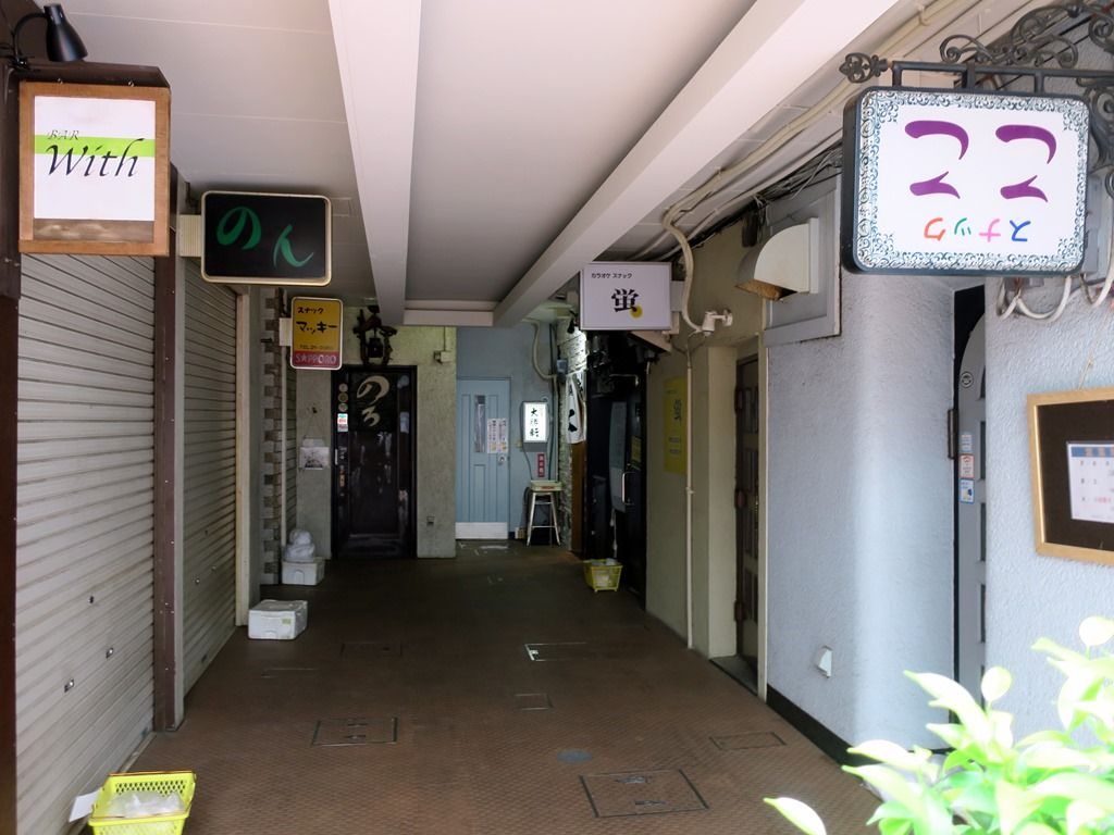 店舗は雑居ビルの一番奥。ビル入口には電光立て看板。