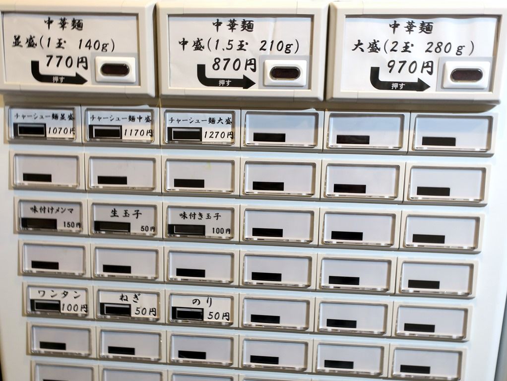 主なメニューは、中華麺 並盛(1玉140g)770円、中盛(1.5玉210g)870円、大盛(2玉280g)970円、他。移転前にあった塩味・つけ麺・油そばは常連向け裏メニューとか。
