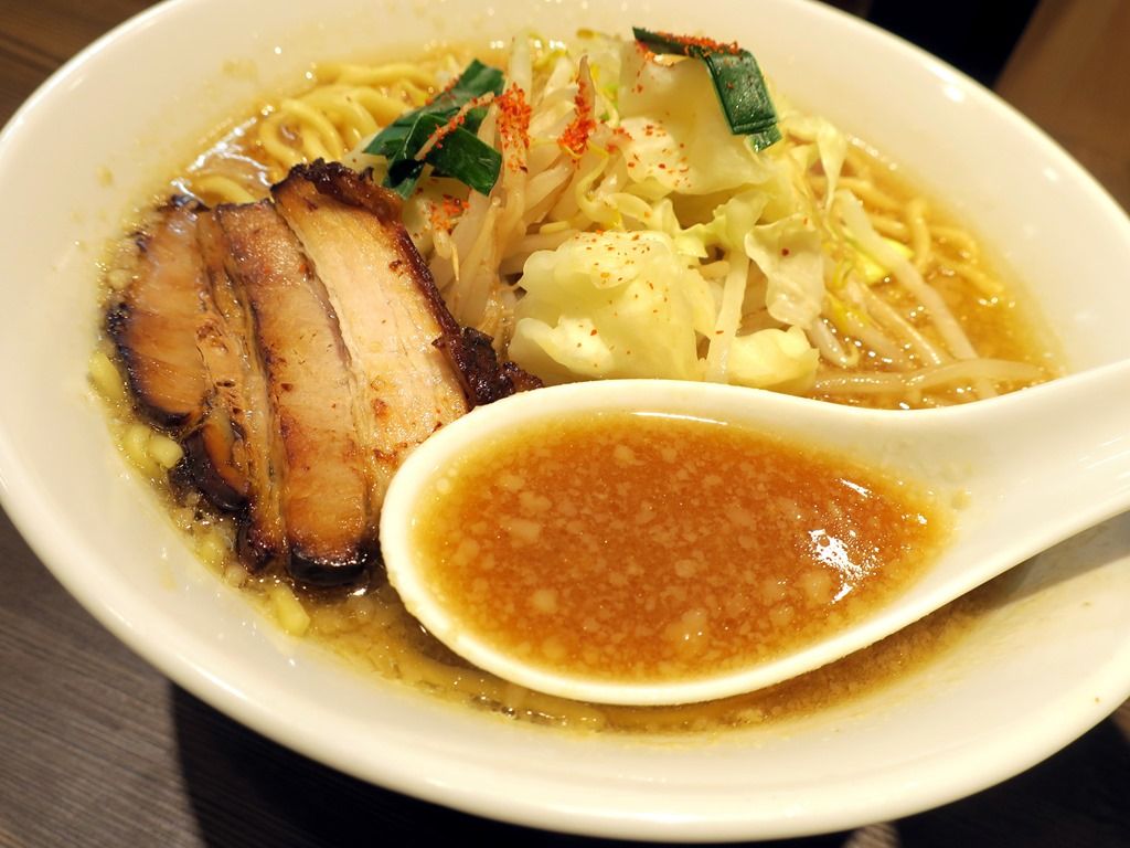 野菜はキャベツ:もやしがハーフ&ハーフでちょうどいい比率。多めの野菜に背脂醤油でガッツリ系の雰囲気も。ローストチャーシューは実に香ばしくて柔らかく美味。