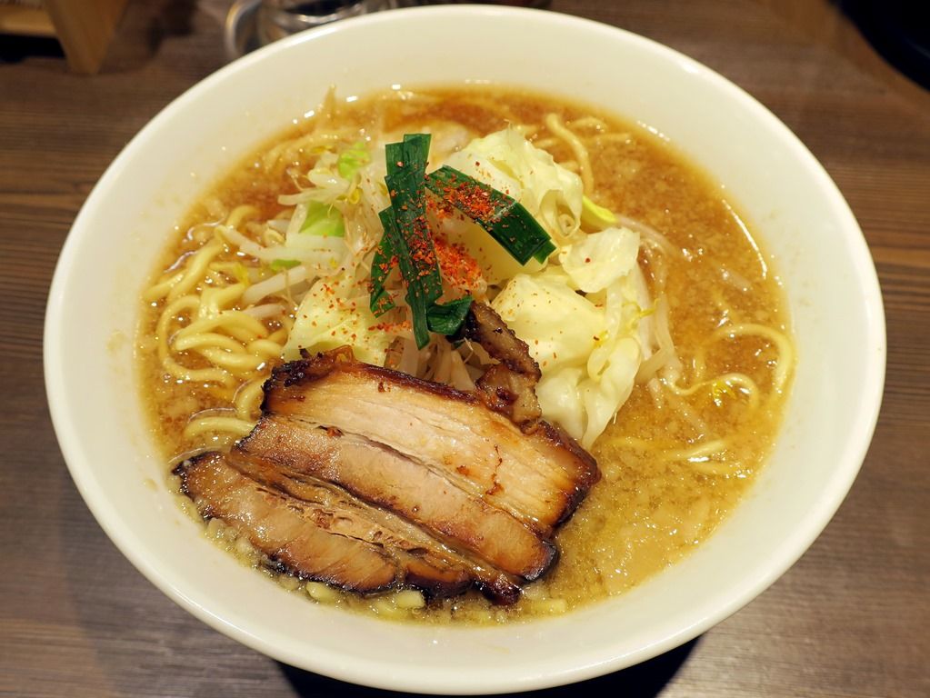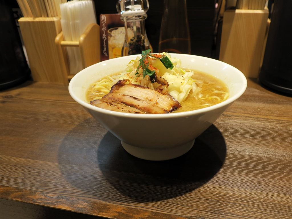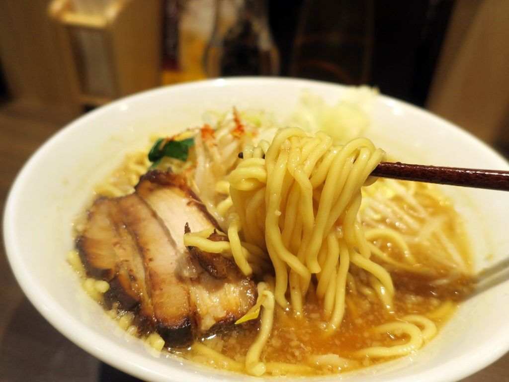 三河屋製麺製の麺はストレート中太タイプ。どちらかというと優しいスープに対して、存在感のある太麺をセット。それはいいですが、デフォでガチムチに固めゆで加減で、麺の個性がさらに際立つ結果に。たっぷり目の野菜と大きなチャーシューもあって、さらにスープが押され気味なシフトに。