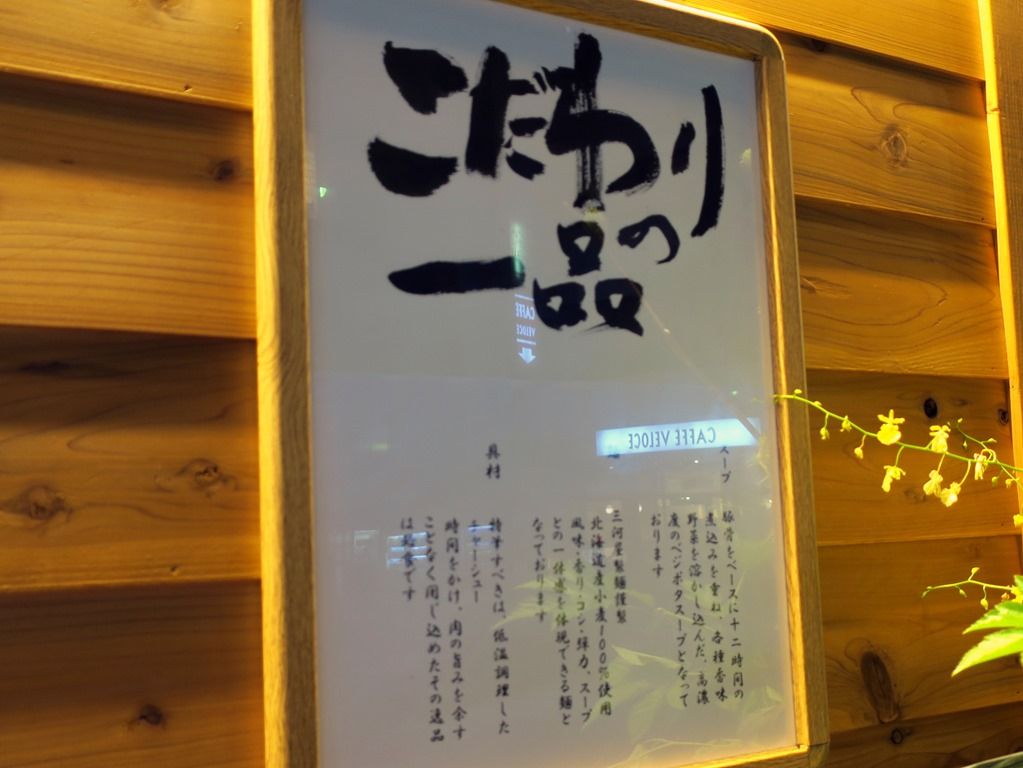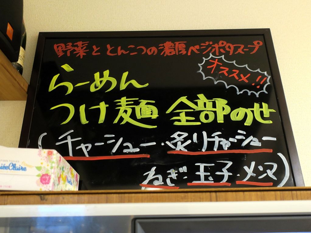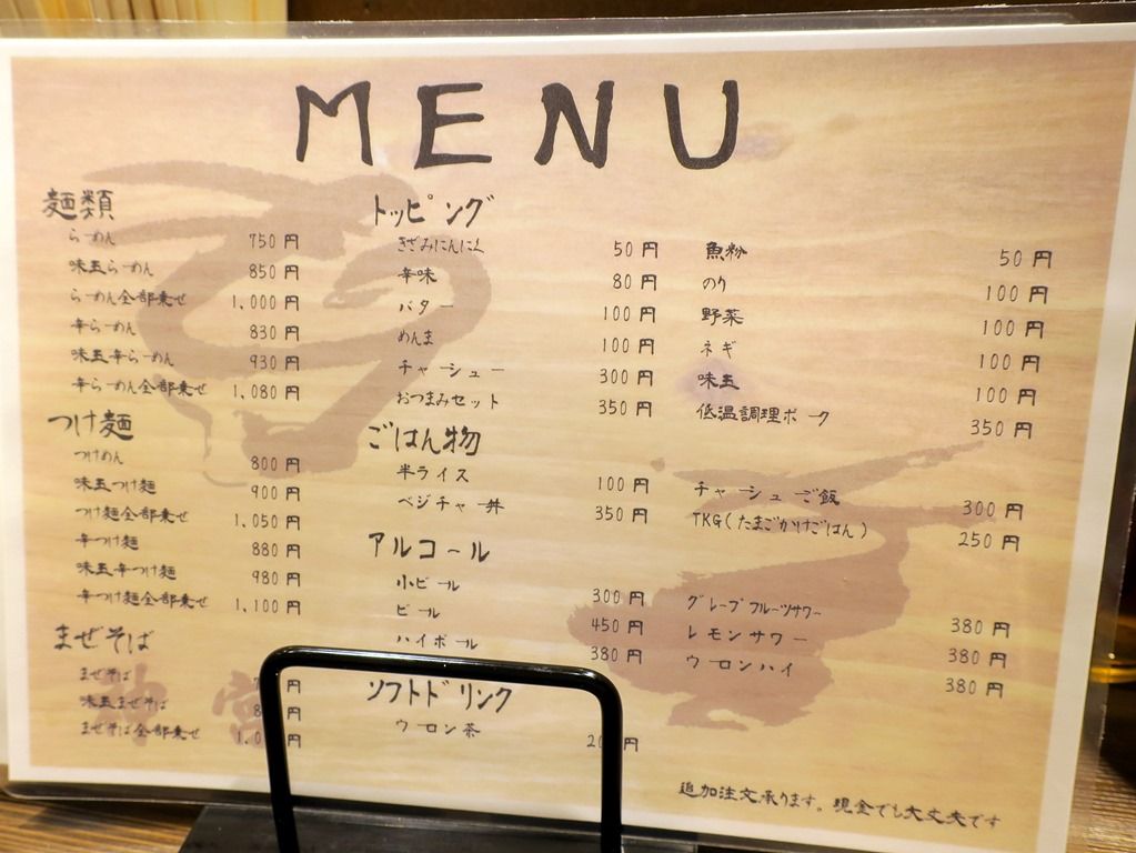 主なメニューは、らーめん750円、辛らーめん830円、つけ麺800円、まぜそば780円、チャーシューごはん300円、ベジチャー丼350円、TKG250円、他。