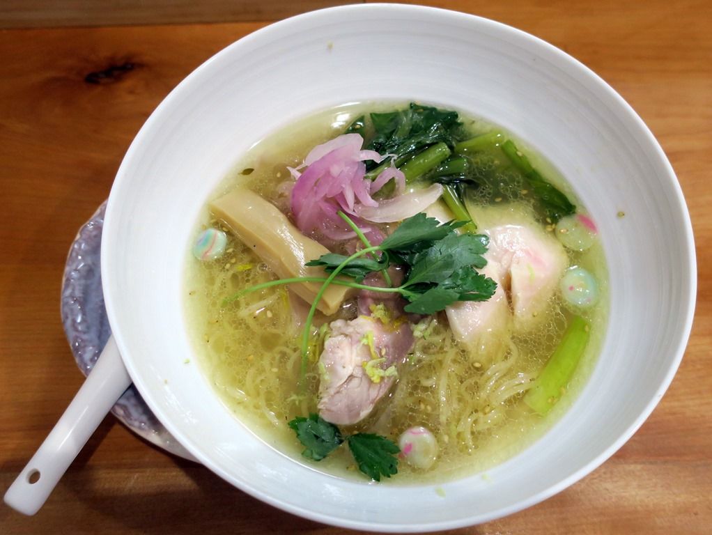 具は、チャーシュー、鶏チャーシュー、メンマ、三つ葉、青菜、まり麩、紫玉ねぎのマリネ?ピクルス? 仕上げに、わさびとレモンをおろし金で軽く挽いて出来上がり。