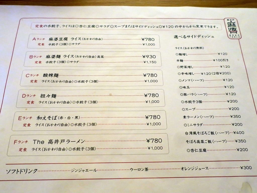 券売機は無く後会計制。主なランチメニューは、Aランチ 麻婆豆腐 ライス780円、Bランチ 麻婆麺 ライス 930円、Cランチ 酸辣麺780円、Dランチ 担々麺780円、Eランチ 和えそば(赤・白・黒)780円、Fランチ The高井戸ラーメン780円、他。