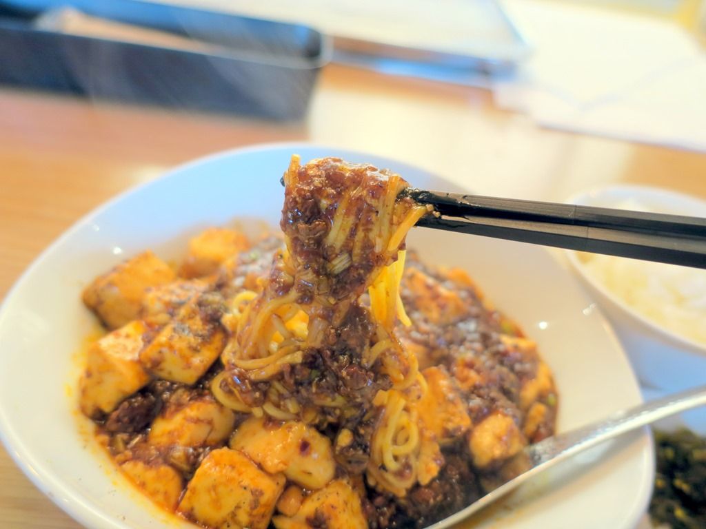 麺はストレート中太タイプ。ゆであげて良く湯切りした麺を皿に盛って、その上から麻婆豆腐をかけた感じ。なので、良く混ぜる必要があります。最初は汁っけのない温かい麺がくっついて混ぜにくいですが、麻婆餡が麺に馴染んでくると、一気によく混ざるようになります。もっちり感のある麺で、麻婆豆腐が絡んで至福の味わいに!