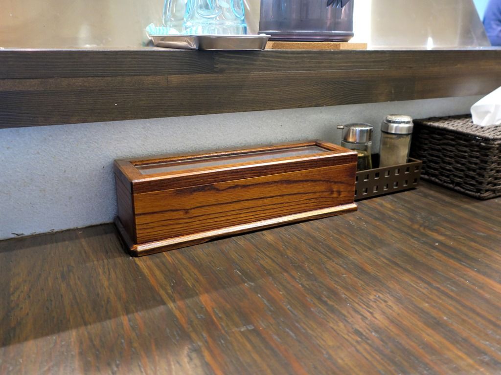 BGMはラジオ。箸は割り箸。卓上調味料は、胡椒、酢。