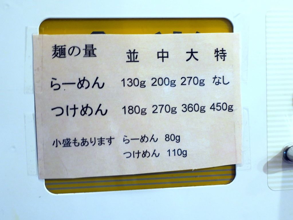 麺量がらーめん並130g 中200g 大270g 小80、つけめん並180g 中270g 大360g 特450g 小110g。