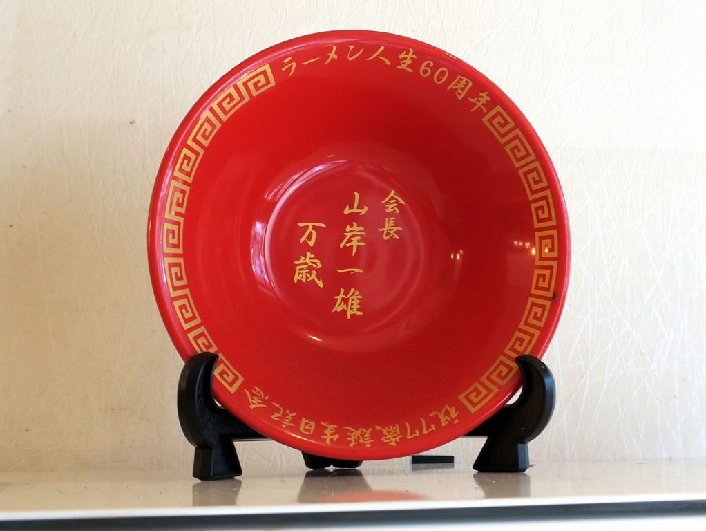 後のお客さんが聞いてましたが、やはりお店の看板メニューは醤油。ですが店主さんは、塩も大好きだそうです。券売機上には山岸マスターのラーメン人生60周年記念丼が飾られていました。