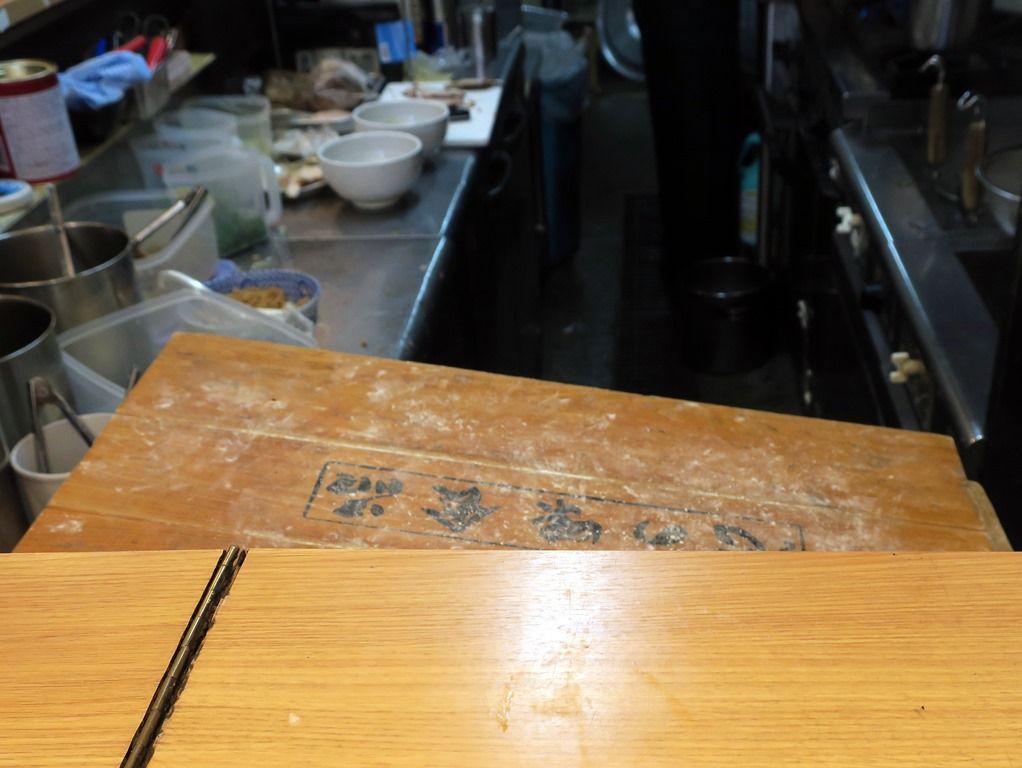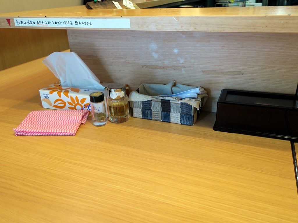 厨房には店主さん、ワンオペ体制。麺箱は心の味製麺のもの。BGMはポップス。箸は割り箸。卓上調味料は、酢、胡椒。