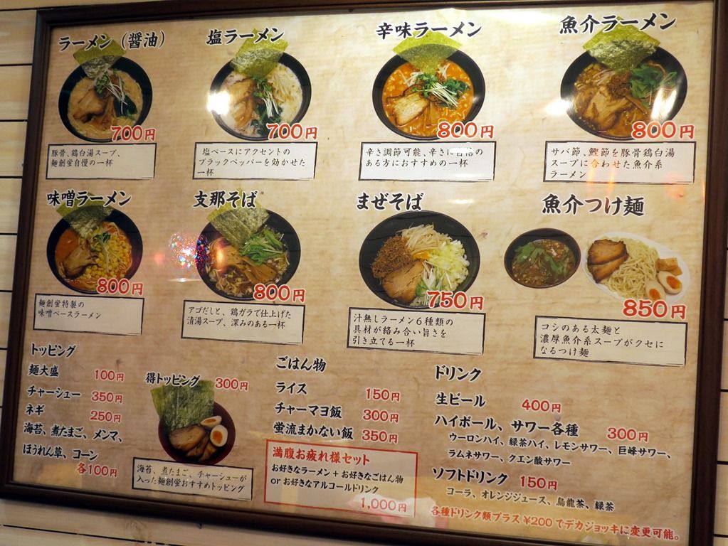 主なメニューは、ラーメン(醤油)700円、塩らーめん700円、辛味ラーメン800円、魚介ラーメン800円、味噌ラーメン800円、支那そば800円、まぜそば750円、魚介つけ麺850円、他。なんと8種類のラーメンをラインナップ。