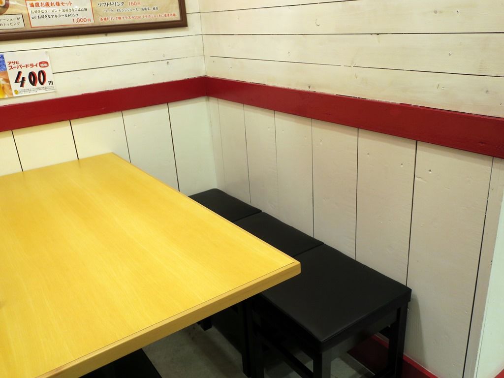 BGMはJ-POP、鬼塚ではありません^^; 箸は割り箸。卓上調味料は、醤油、酢、豆板醤、おろしにんにく、GABANコショー。