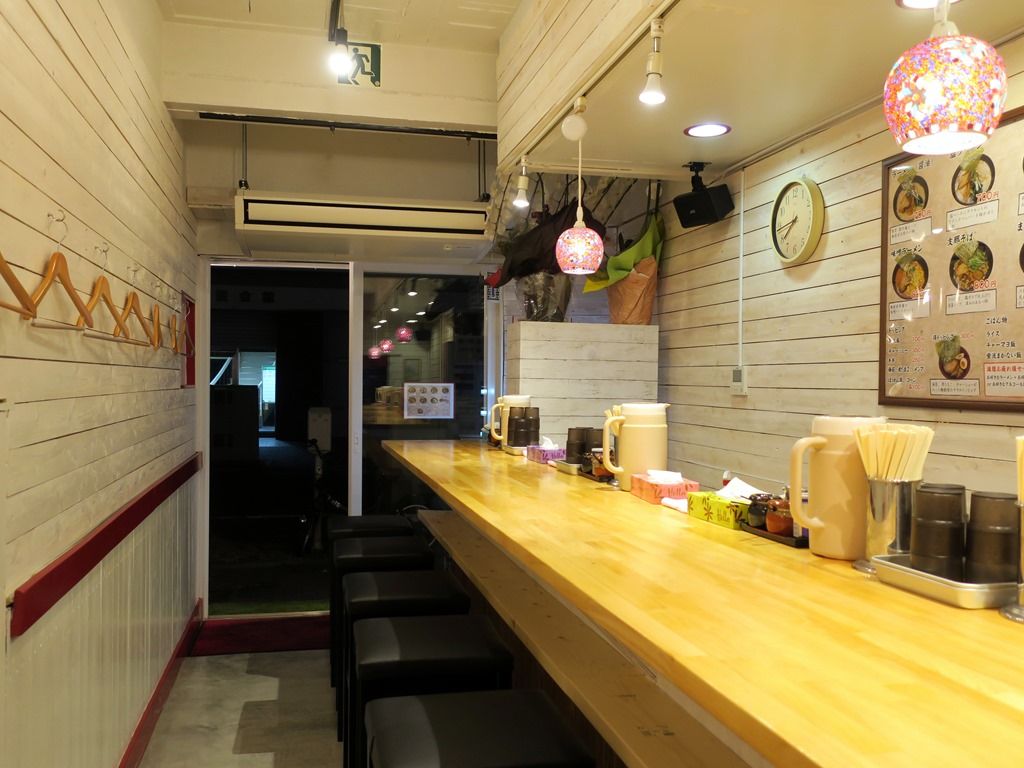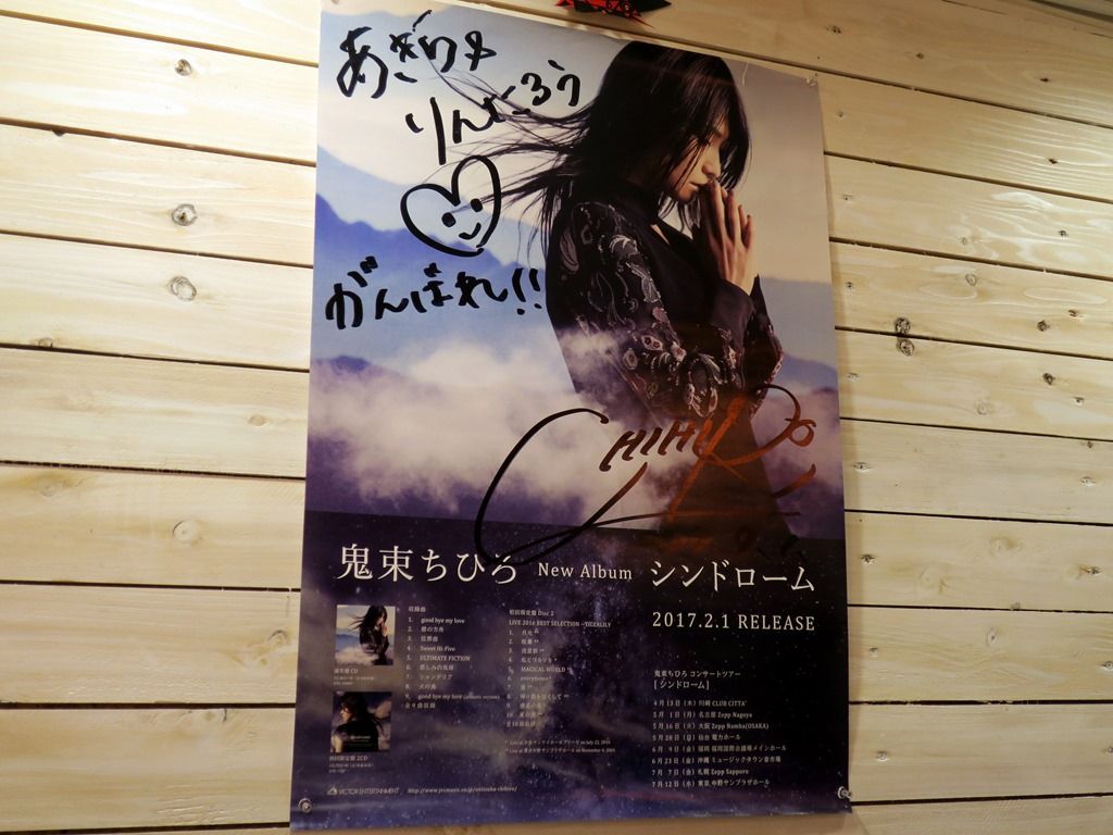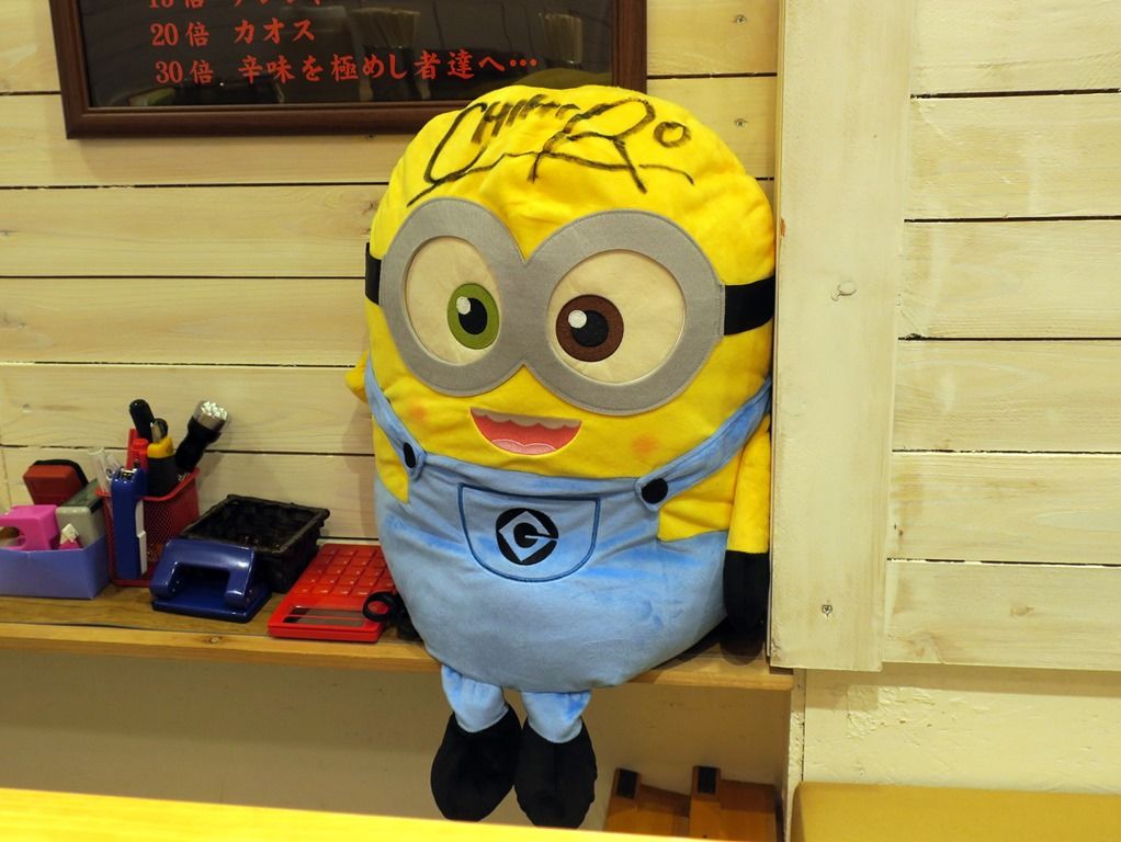 厨房の方と一緒に二人の修行先は、川崎の「麺屋 だるま家」だそうです。二人で協力して独立、新店を立ち上げたとか。奥の壁面には、鬼束ちひろさんから二人へ向けた応援メッセージ&サイン入りポスター掲示。サイン入りミニオンのぬいぐるみも。