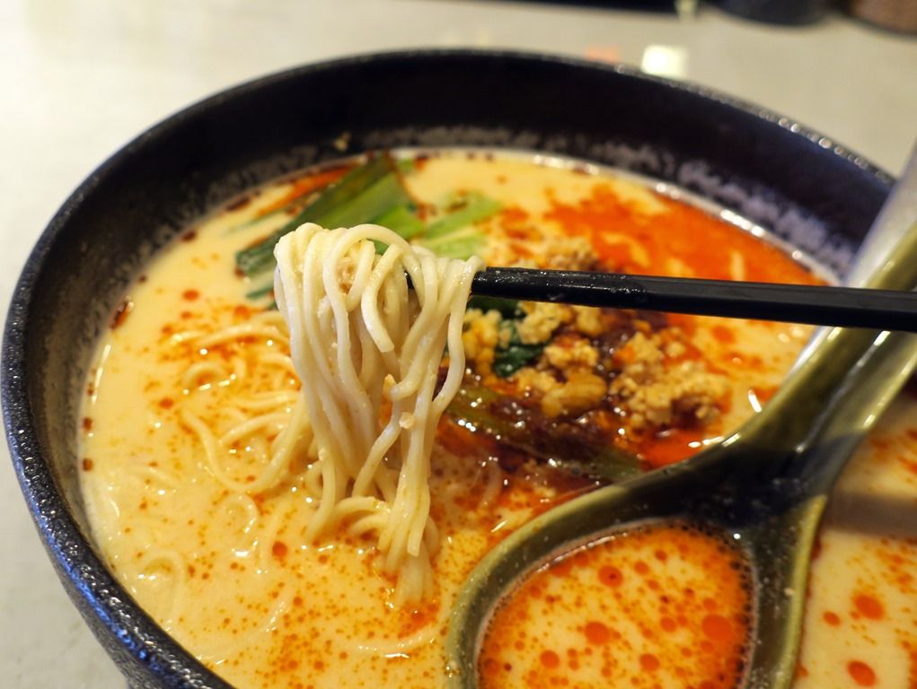 スープはクリーミーな担々胡麻味。鶏ガラと魚介スープがベースの胡麻ダレ仕立て。見た目通りとっても胡麻がしっかり効いていてごまリッチなテイスト。また、これもビジュアル通りあまり辛くありません。ただ、痺れ辛さは卓上アイテムで自分好みに如何様にもチューニング可能。コク深いまったりとした味わいでとても美味しい!