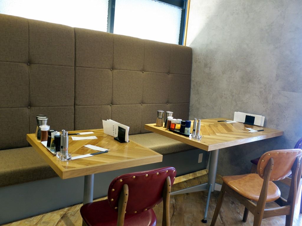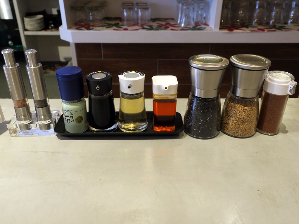BGMはポップス。箸は洗い箸でエコ仕様。卓上調味料は、ミル入りピンクロックソルト・ブラックペッパー、GABAN高知県産・仁淀川山椒、醤油、酢、ラー油、黒胡麻、白胡麻、一味唐辛子。