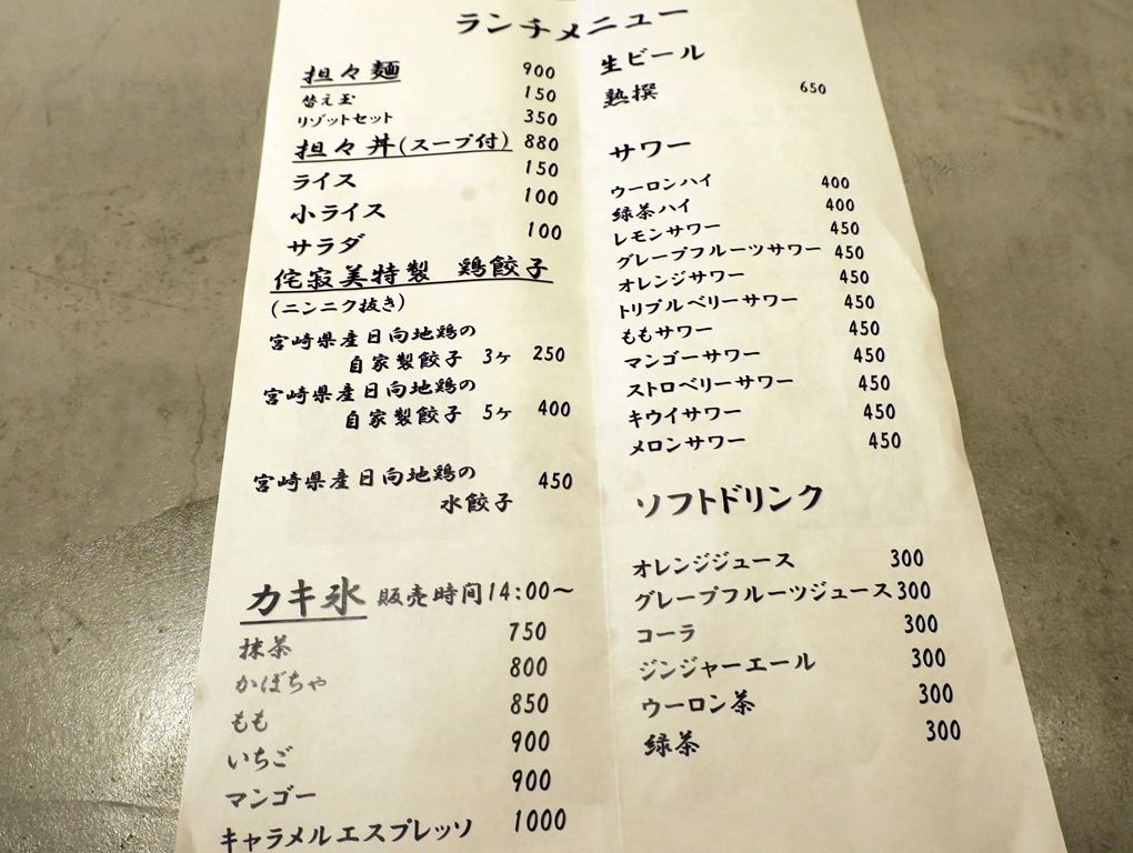 券売機は無く後会計制。主なメニューは、担々麺900円、リゾットセット350円、担々丼(スープ付き)980円、カキ氷各種750円~(14:00~)、他。看板メニューの担々麺は1種類でエースが分かりやすい構成。