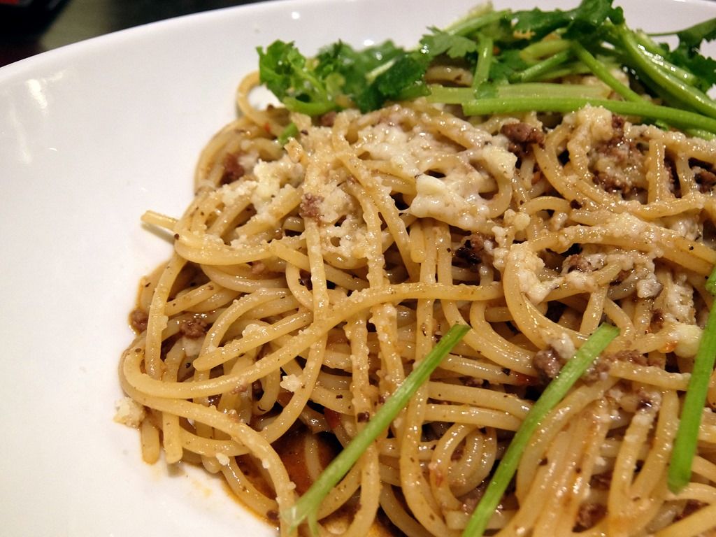 麻婆豆腐が載ってなくて、ひき肉を麻婆ソースで炒めてパスタと和えた一品。麻婆炒飯同様麻婆豆腐がけを期待してたので、ちょっと残念。