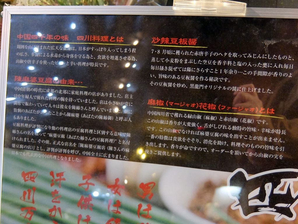 看板には「Produce by 池袋黒龍門」の文字。「池袋黒龍門」と言えば、総料理長があの陳建民氏の愛弟子とのこと。麻婆系期待出来そう!