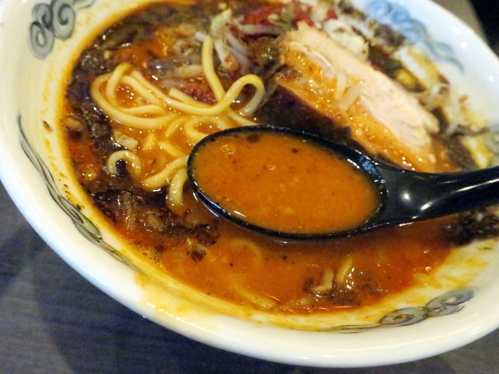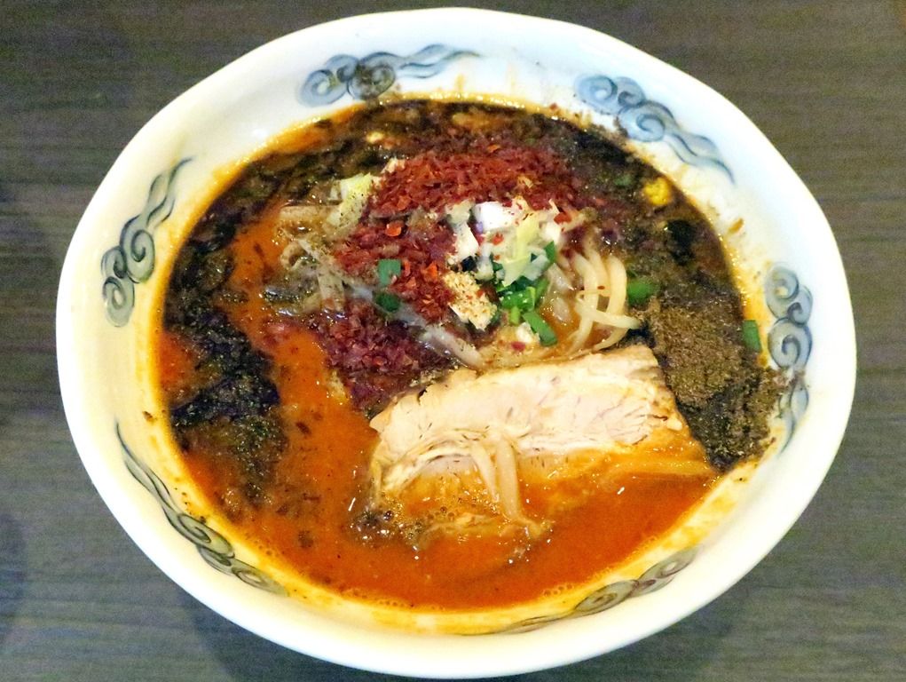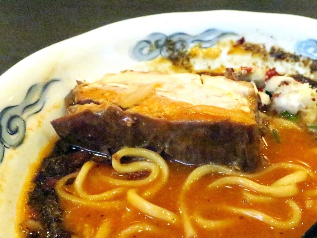 チャーシューがとんでもなく分厚くて、エアーズロック的な角煮状態。ただ、タンタンは適度なサシが入ってめっちゃ柔らかくぷるぷるでしたが、こちらは全部赤身でぱさついた感じ。まあ部位的な問題でたまたまかもしれません。