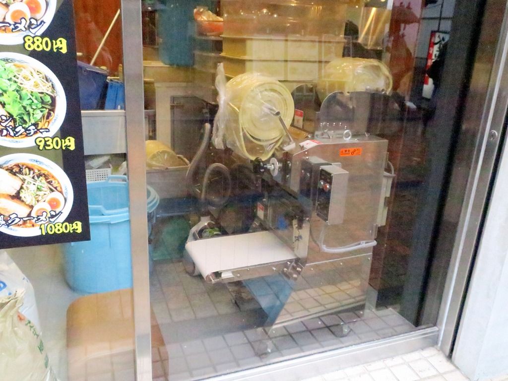 店舗向かって左にガラス貼りの製麺室、中には麺帯が装着されたままの製麺機が鎮座しています。