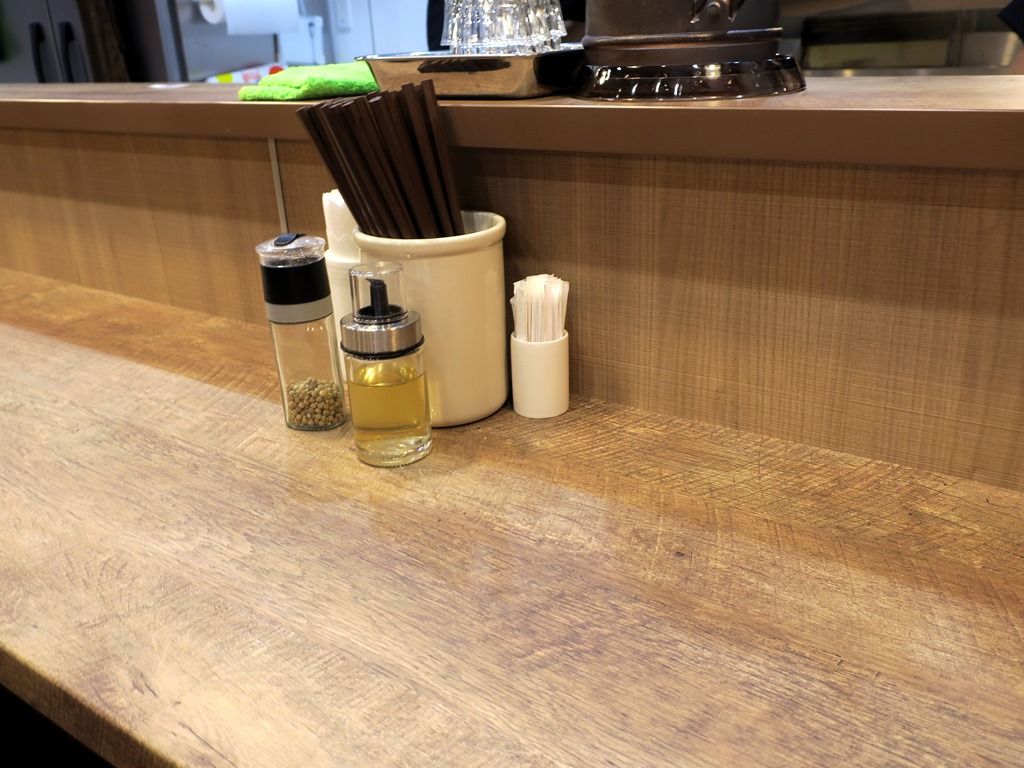 BGMはフュージョン的な。箸は洗い箸でエコ仕様。卓上調味料は、粒白胡椒、酢。