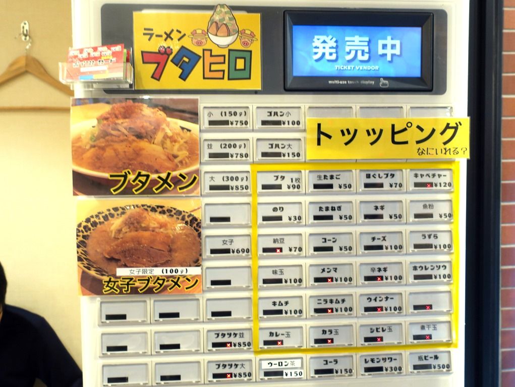 開店直前ムタさん、ヒロさんの挨拶があり、定刻にオープン!入店すると、まず券売機で食券購入です。主なメニューは、ブタメン小150g750円、並200g780円、大300g800円、ブタメン女子100g690円、ブタツケ並・大850円、お子様ラーメン無料、他。