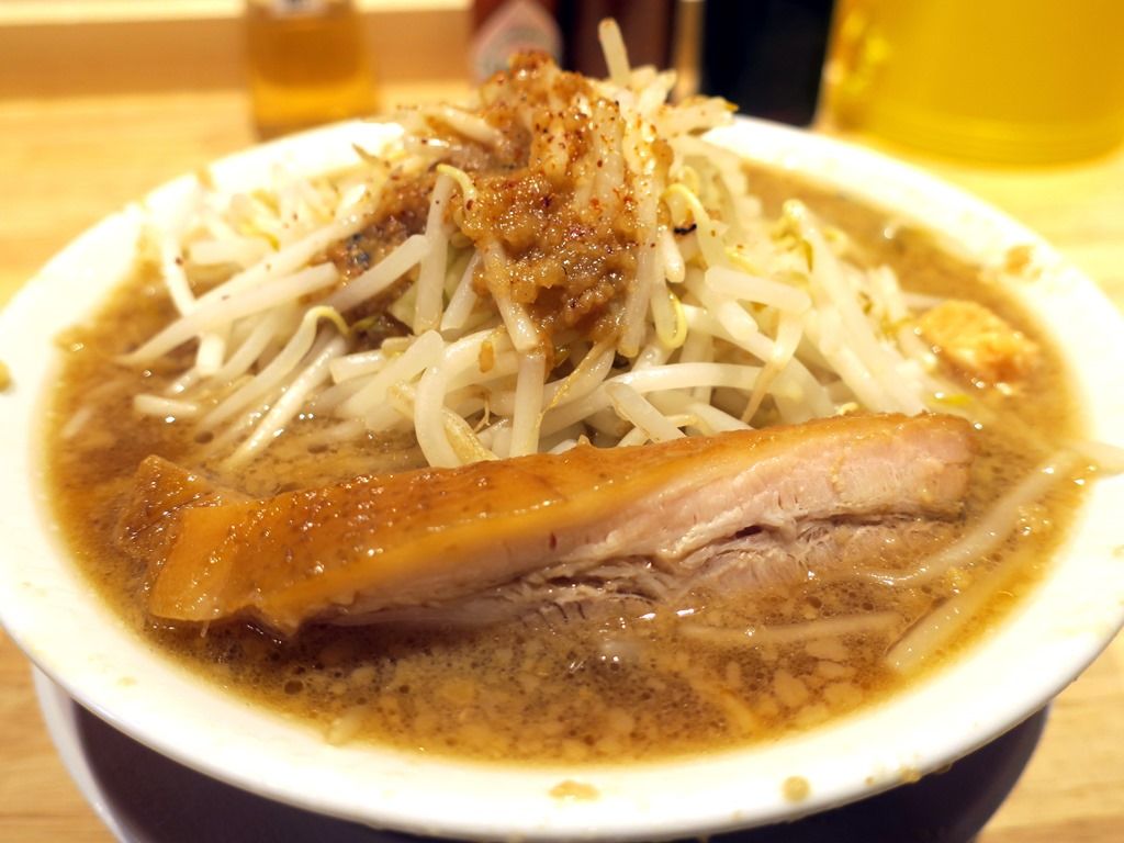 具は、ブタ、ヤサイ(モヤシ・キャベツ)。ワタシの時はモヤシ9.5:キャベツ0.5。トップには背脂と一味。