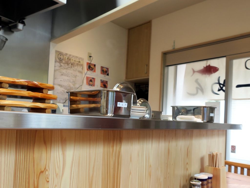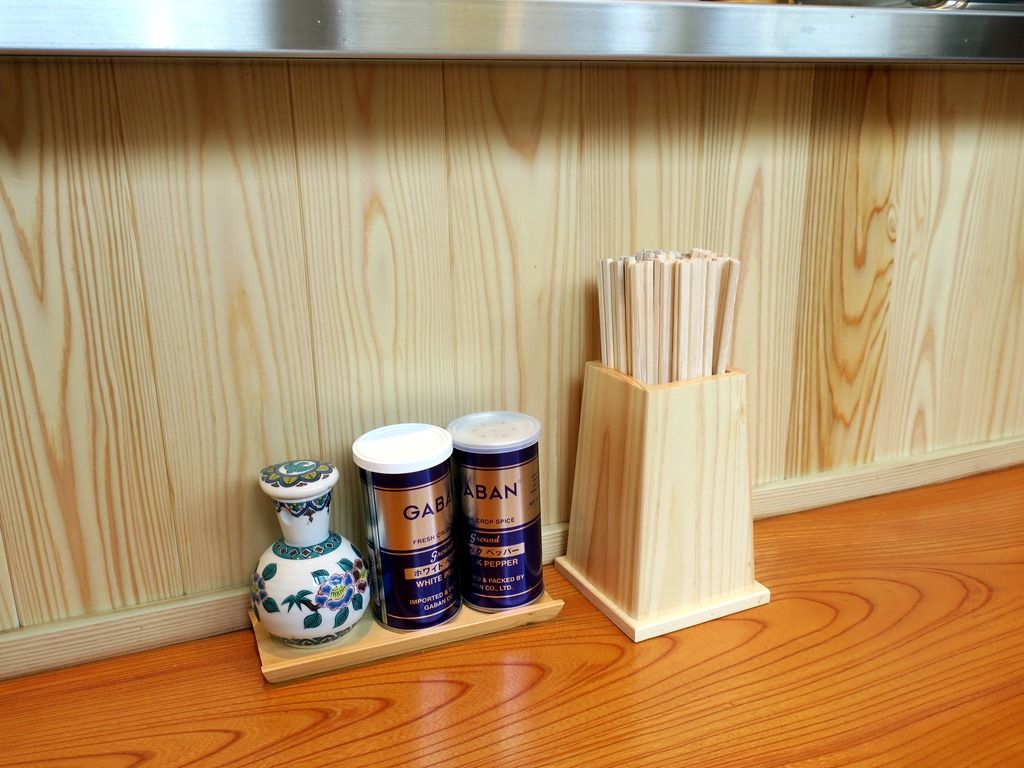 写真は取れませんでしたが、厨房には小松製麺の麺ケース。BGMはご当地ラジオbayFM。箸は割り箸。卓上調味料は、GABANブラック・ホワイトペッパー、寿司用のむらさき。レンゲはカウンター上のステンレストレイに用意。