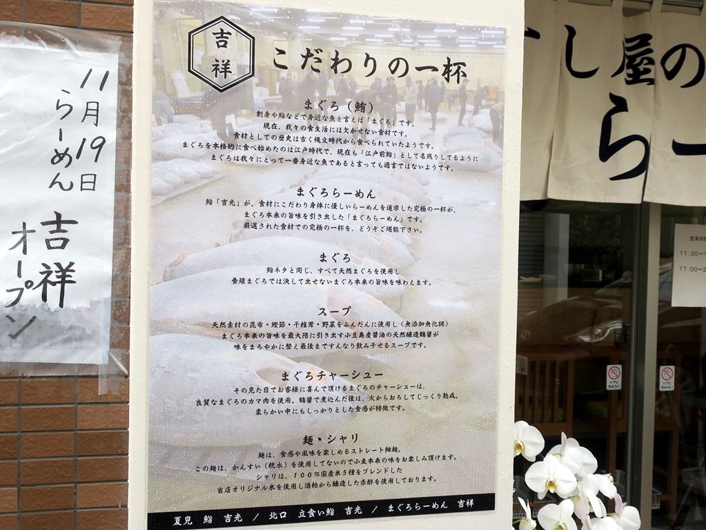 2017年11月19日オープン。船橋で行列の出来る立ち食い寿司店「吉光(きっこう)」が手がけるラーメン専門店。異業態進出ですが、ノウハウを活かしたまぐろラーメンを提供とのことで、興味津々です!