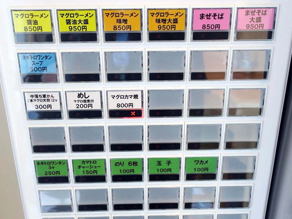 主なメニューは、マグロラーメン醤油、マグロラーメン850円、まぜそば 各850円、中落ち軍かん2ケ300円、他。オーダーは券売機先頭左端のマグロラーメン醤油で。お寿司屋さんってことで、軍かん巻きもポチリ。