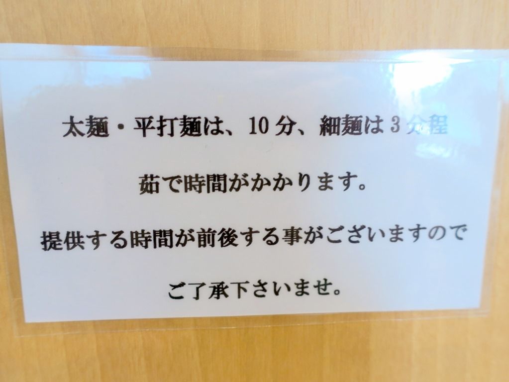 カウンターに薀蓄掲示。麺はその日に打った打ち立て。最後までおいしくいただけるように、敢えて水を絡ませた状態で提供。