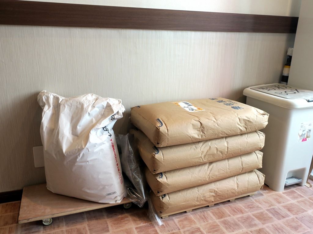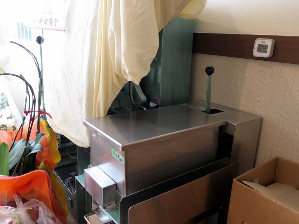 外から見える窓際に製麺機設置。反対側の壁際券売機横に製麺用の小麦粉。